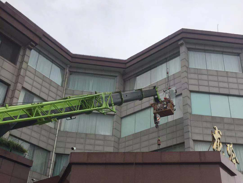 • 上海悅?cè)A大酒店幕墻玻璃更換施工現(xiàn)場照。